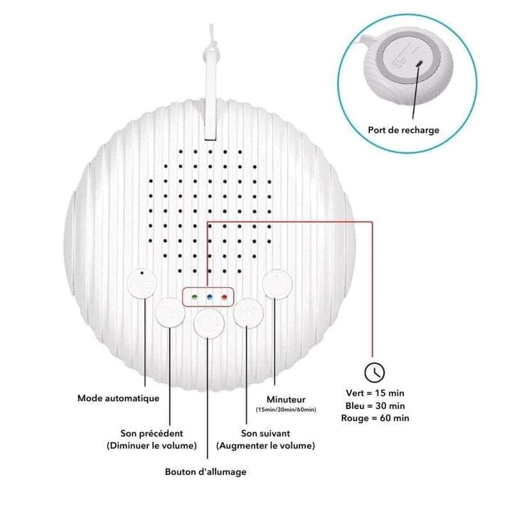 Plongez dans un océan de tranquillité avec Zzz-Pocket™, offrant 10 sons naturels, dont bruit blanc, vagues, chants d'oiseaux, battements de cœur, et plus. Facile à utiliser, créez un environnement idéal pour le sommeil, la relaxation ou la concentration.